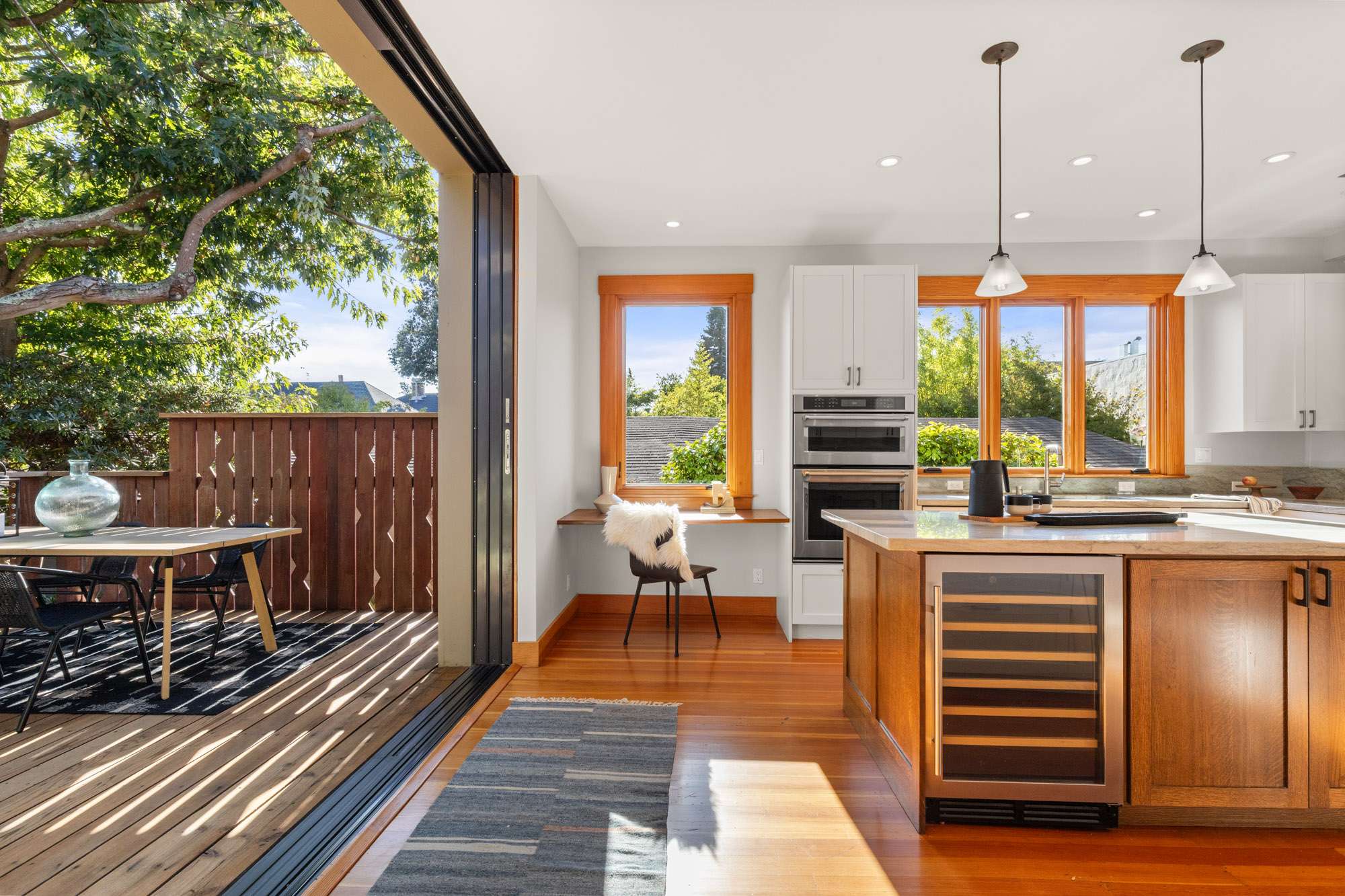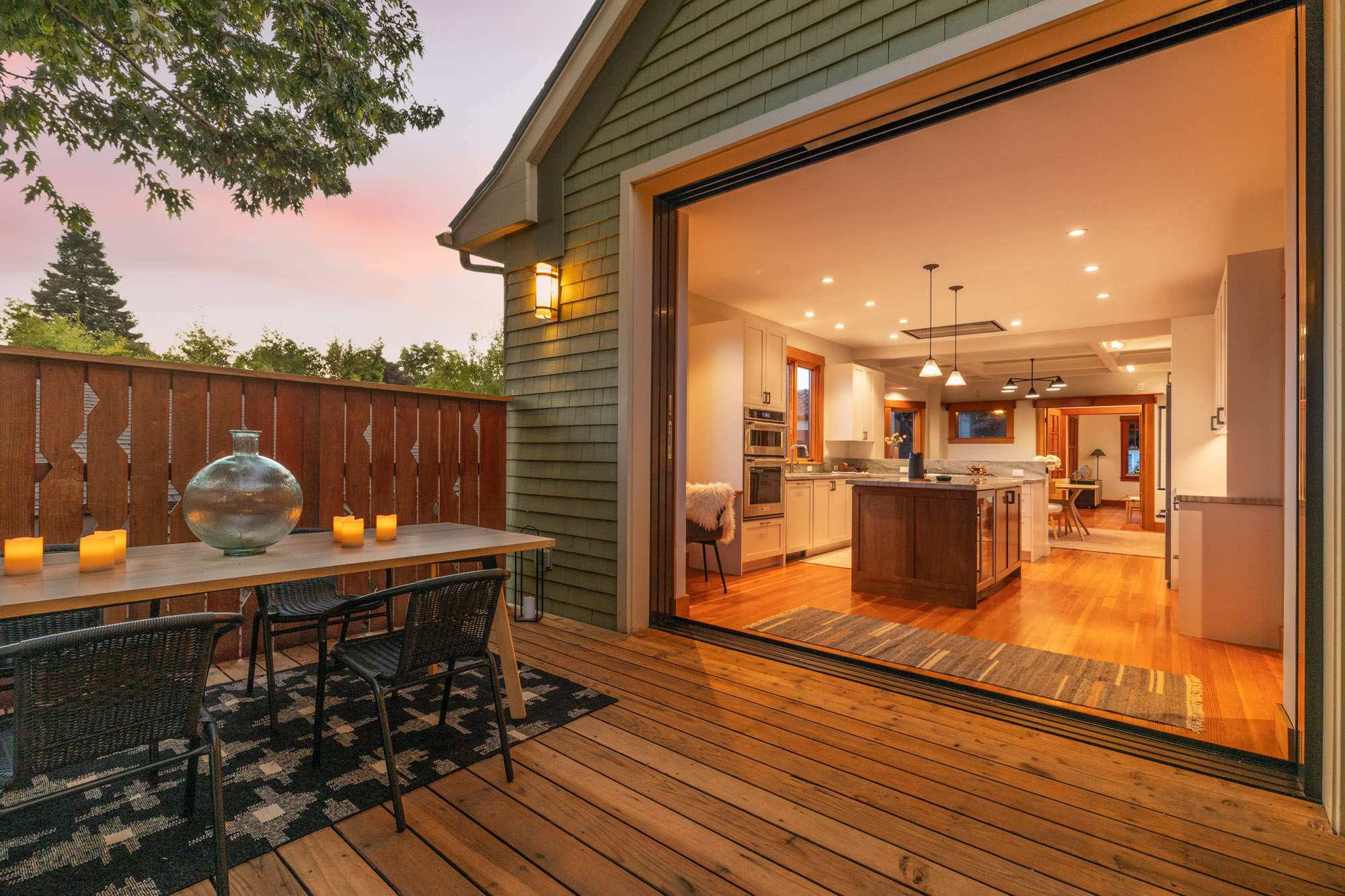 At the heart of the home is a spectacular chef’s kitchen featuring a gorgeous island with quartzite countertops and backsplash, a breakfast bar, built-in desk, high-end appliances, ample storage, and glass doors that slide into the wall, opening out to a redwood deck and the majestic maple tree-- blurring the line between indoors and out.