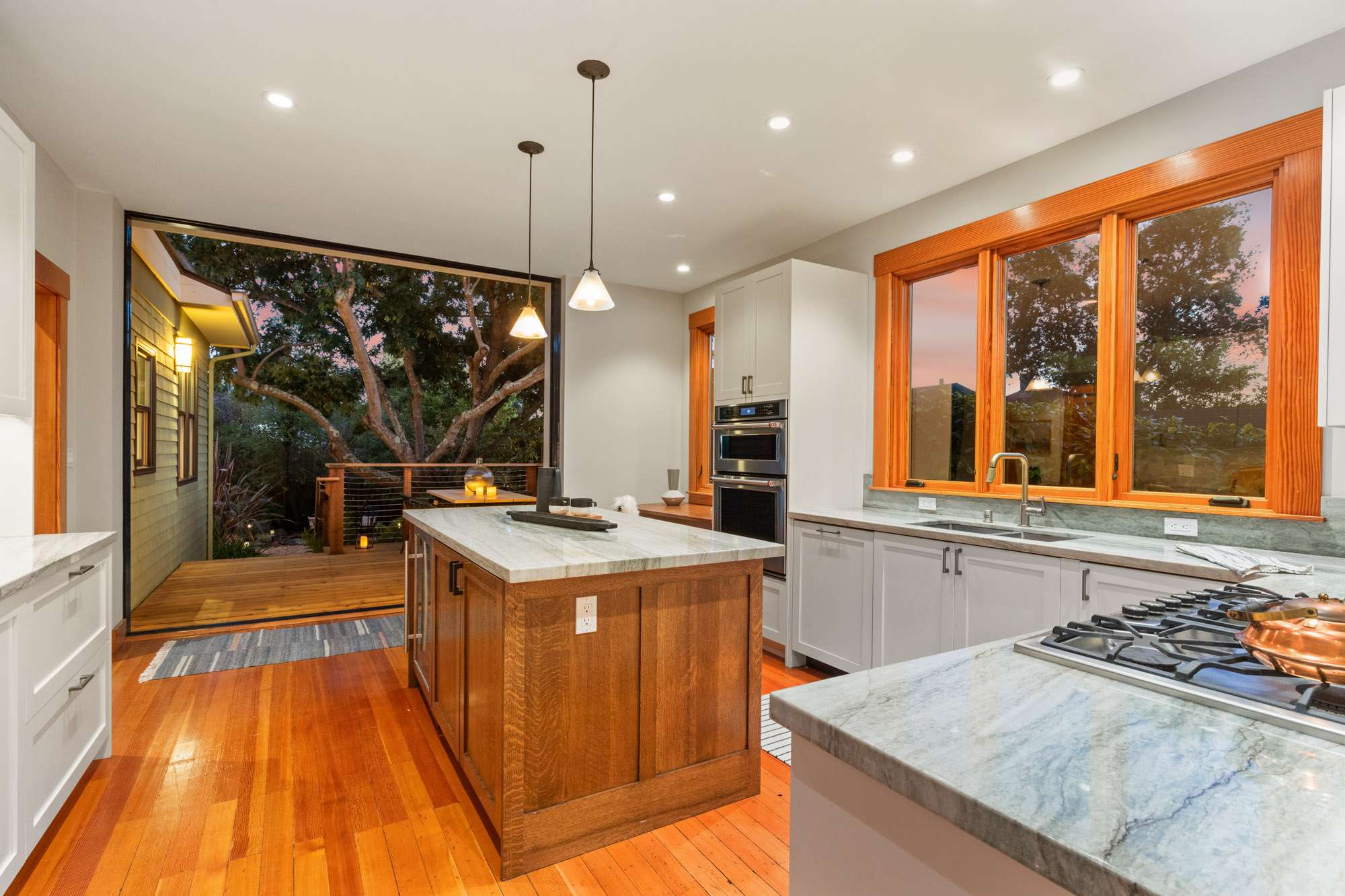 - Spectacular remodeled chef’s kitchen (2017), featuring a quarter-sawn oak island with quartzite countertops, a built in desk, and a breakfast bar–and large glass sliding "La Cantina" doors that disappear into the wall for seamless indoor-outdoor living