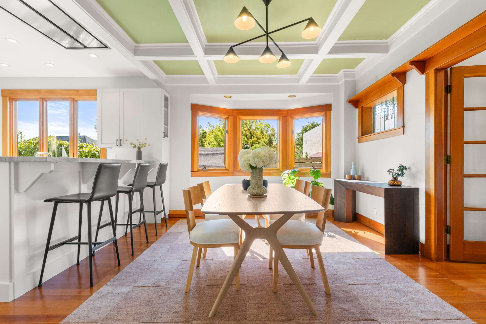 - Dining room with box-beam coffered ceilings, bay window, and a stylish light fixture